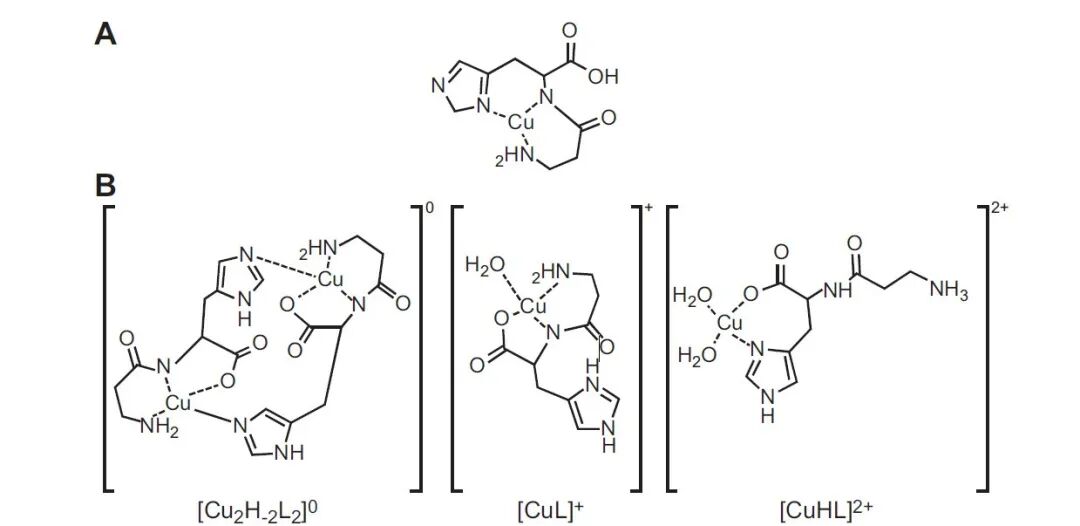 它应该是络合金属离子比如铁离子、铜离子而起到这个作用。所以大胆的猜测,肌肽与蓝铜肽可以协同(虽然肌肽和蓝铜肽在一起会变色)。见图14.