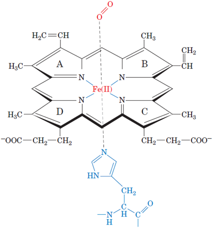 血红素的结构,在卟啉环中间有一个亚铁离子,上下各有一个组氨酸残基(上面未画出),氧分子(O2)能与Fe(II)紧密接触使其氧化为Fe(III)。