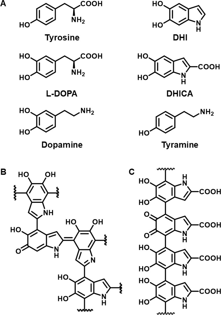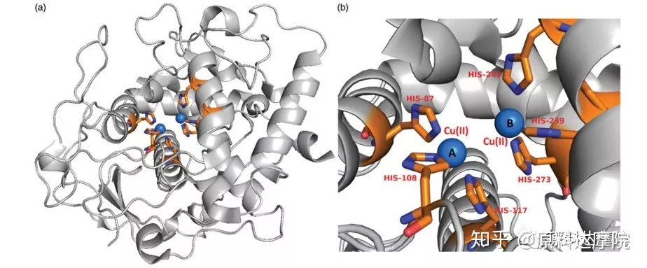 咪唑基是一个非常有意思的基团,它对金属离子具有很好的络合作用,最典型的是酪氨酸酶,2个铜离子与三个组氨酸的亚氨基络合(图10),可对单酚或者多酚催化。比如将酪氨酸催化生成多巴,最后生成黑色素(图11,B、C是真黑素可能的结构)。