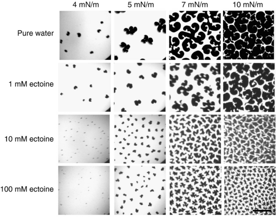 有一篇经典的文献,作者用磷脂单分子层模拟细胞膜,采用不同浓度的依克多因,在不同的渗透压下,观察细胞膜的絮凝情况。纯水里面,随着渗透压的提高,细胞膜磷脂凝聚越严重(黑色代表絮凝的磷脂),依克多因的浓度越高,细胞膜抗渗透压的能力越强。细胞膜的磷脂絮凝之后,便会丧失流动性,影响物质传递,酶的活性等等。而依克多因正是在高盐、强紫外、高温差的环境中生活的嗜盐菌为抵抗外界压力而积累的一种相容性溶质。它能保证细胞在高的渗透压下,细胞膜依然保持流动性,酶的活力不受影响。