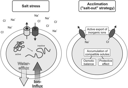 就通过排出盐离子并同时积累相容性溶质来适应这些条件。”