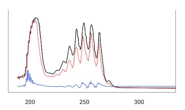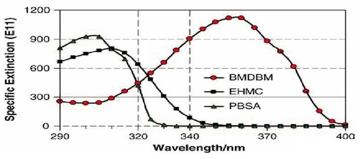 图8.阿伏苯宗(BMDBM)、甲氧基肉桂酸乙基己酯(EHMC)、苯基苯并咪唑磺酸(PBSA)的紫外吸收波段。