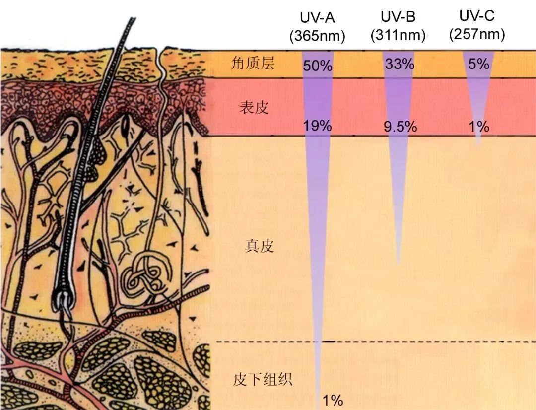 当然波长越短,穿透能力越差;波长越长,穿透能力越强。【比如目前大力发展的5G,已经到达毫米波段(c=ƛ*ʋ),频率更高(能量更高,耗能更多),相比4G,传输效率更高,但是穿透能力弱,所以要架设更多的基站,也更耗电】对于紫外线对皮肤的作用来说,UVA能深达皮下组织,UVB只能到达真皮层(见图3)。