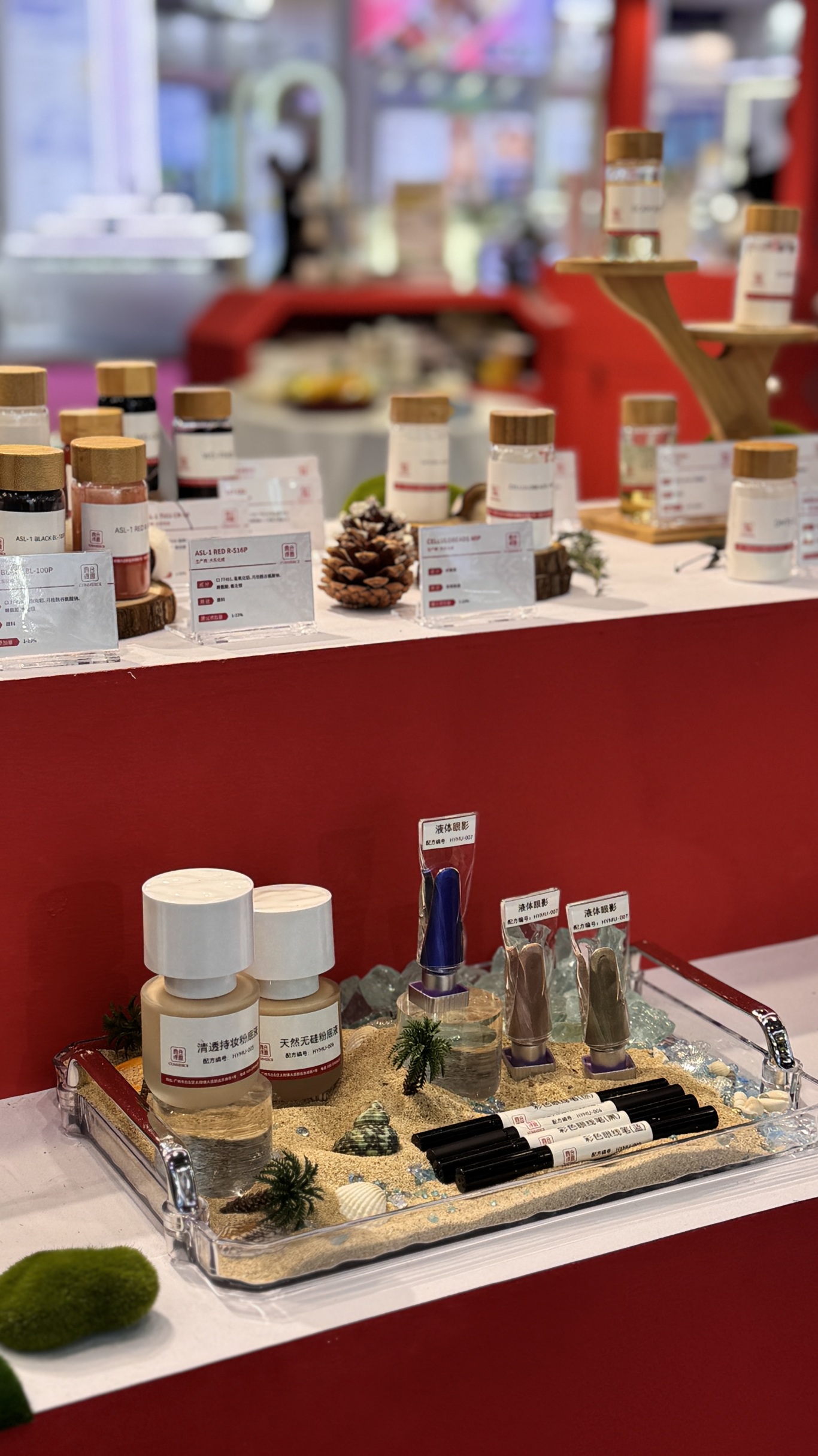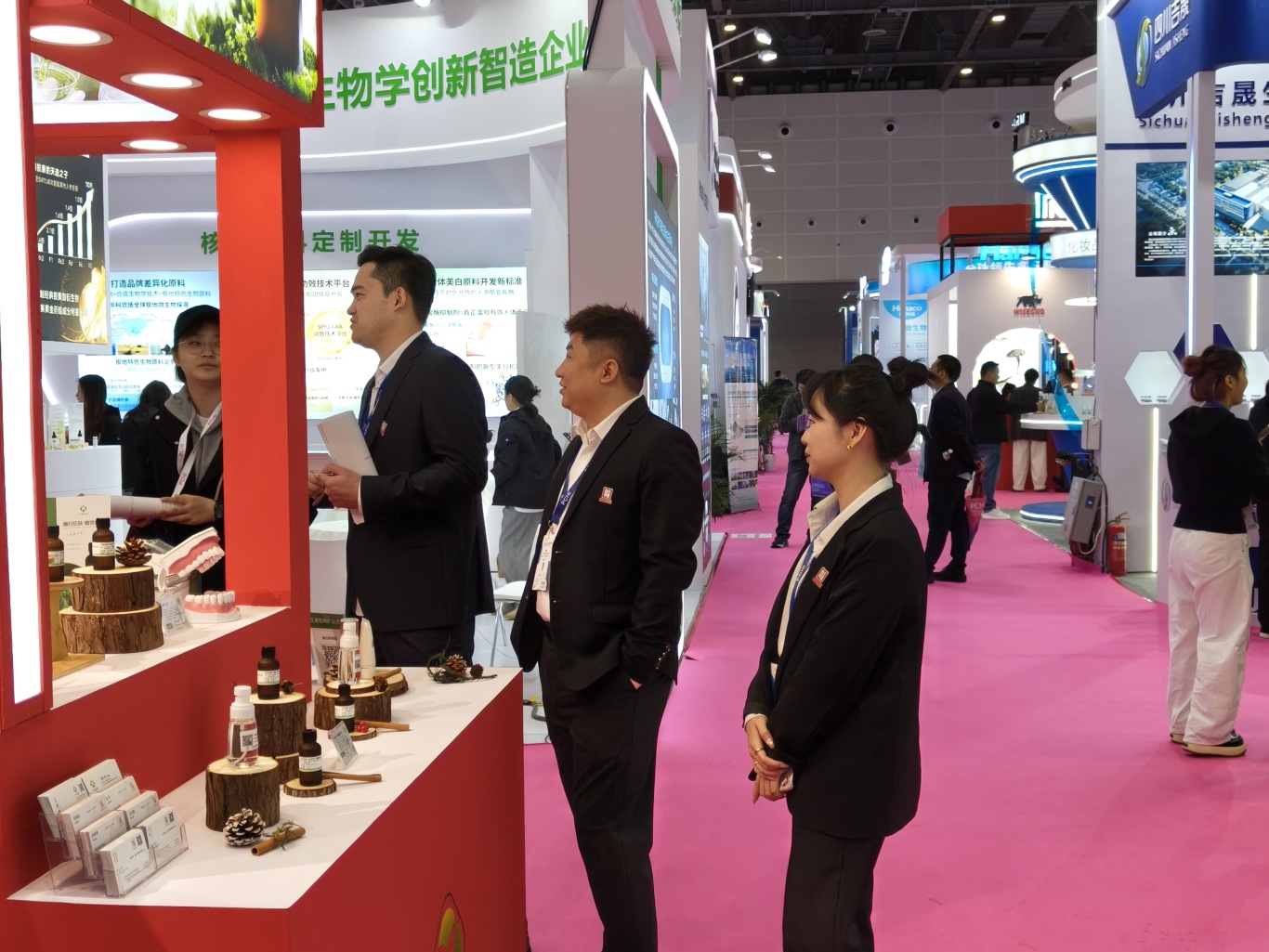 映入眼帘的,还是合壹延续一贯的东方红经典配色,中国红的热烈吸引了大批参展者的好奇停驻。展台内,合壹的小伙伴都在热情耐心地为每一位参观者讲解各类原料及半成品的特性、优势与应用场景!